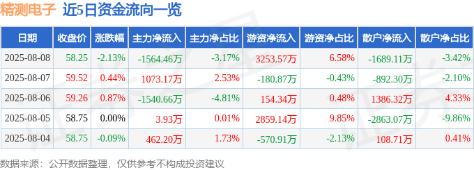 股票行情快报:精测电子(300567)8月8日主力资金净卖出1564.46万元